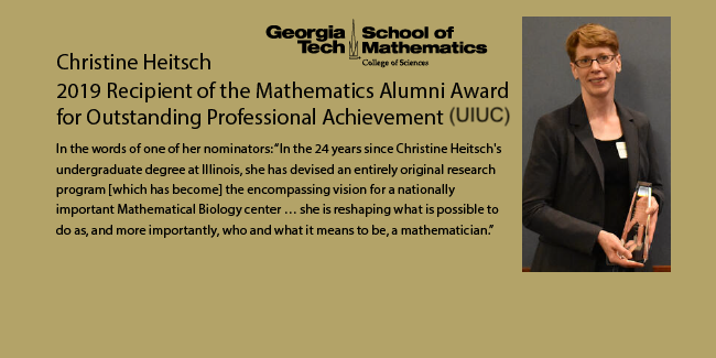 Christine Heitsch is a Professor in the School of Mathematics at Georgia Institute of Technology and is Director of the Southeast Center for Mathematics and Biology (SCMB), an NSF-Simons Research Center for Mathematics of Complex Biological Systems. She received her PhD from University of California Berkeley in 2000. During her trail-blazing career she has leveraged mathematics, especially combinatorics, to understand the role and function of RNA in biological systems. Read more about Christine Heitsch.